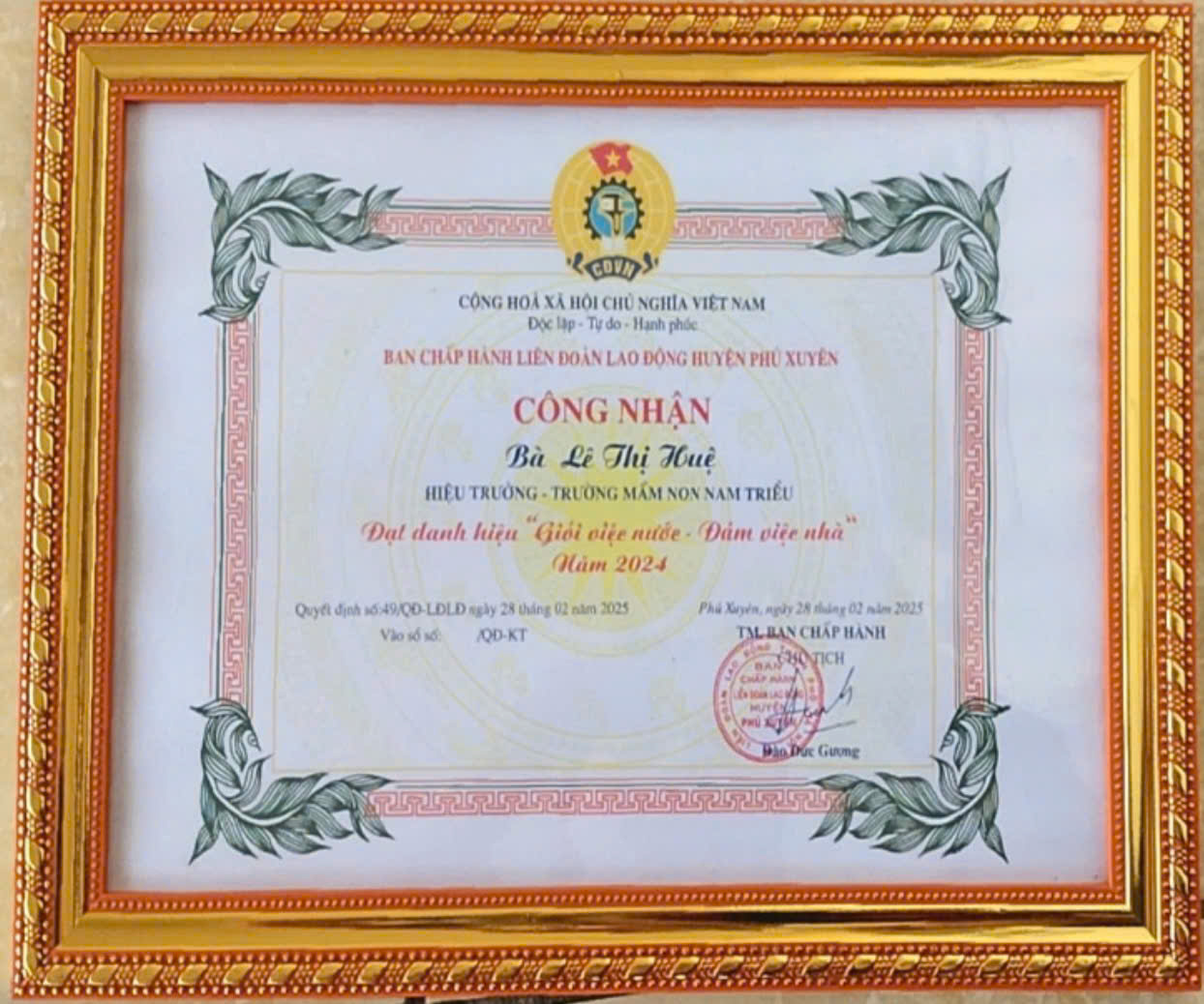 Với chúng tôi – giáo viên trong trường, cô không chỉ là một người quản lý giỏi mà còn là tấm gương sáng để chúng tôi học hỏi. 27 năm công tác trong ngành giáo dục, cô luôn hoàn thành xuất sắc mọi nhiệm vụ được giao. Từ một cô giáo giảng dạy trực tiếp đến khi đảm nhận vai trò Bí thư Chi bộ, Hiệu trưởng nhà trường, cô đã góp phần không nhỏ vào việc nâng cao chất lượng giáo dục mầm non huyện Phú Xuyên nói chung và tại Trường Mầm non Nam Triều nói riêng.